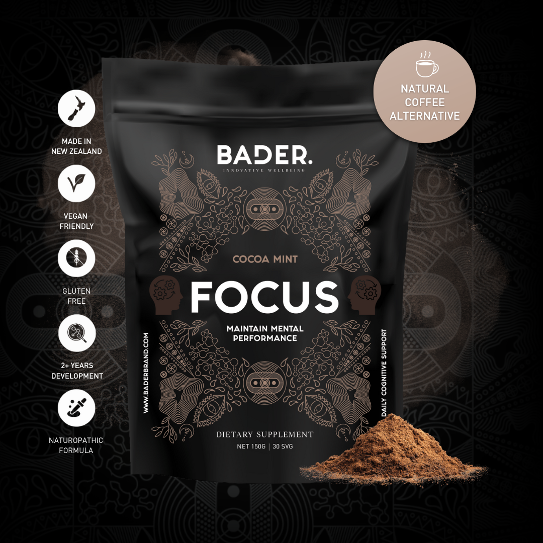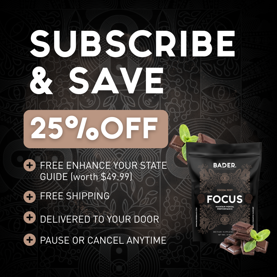 Bader Focus is a formula carefully created after 2+ years research and development by naturopath and Bader co-Founder Ryan. The blend of nootropic ingredients, adaptogens and amino acids is designed to support brain health, mental clarity and calm focus. Focus invites a balanced, sustained energy to help you stay sharp and on task without the crash.