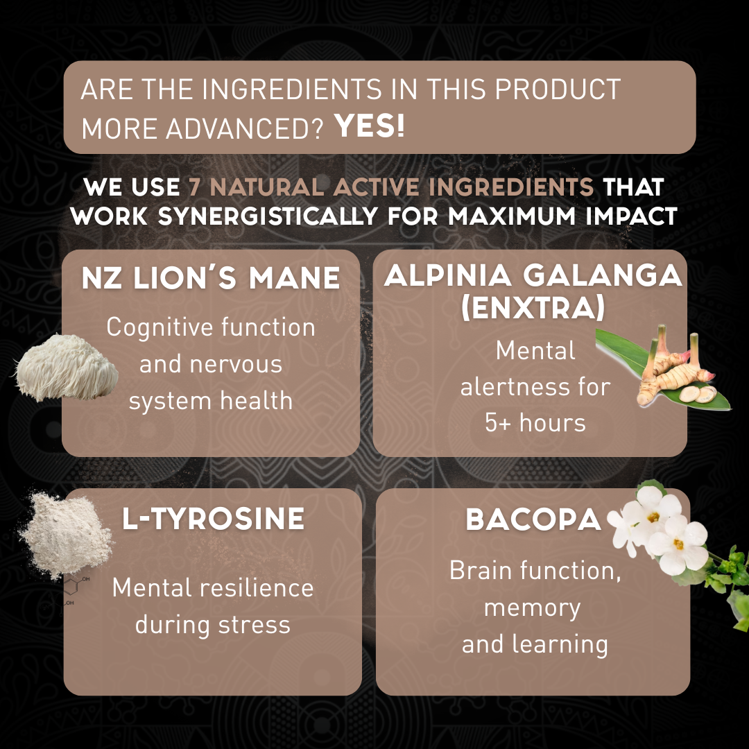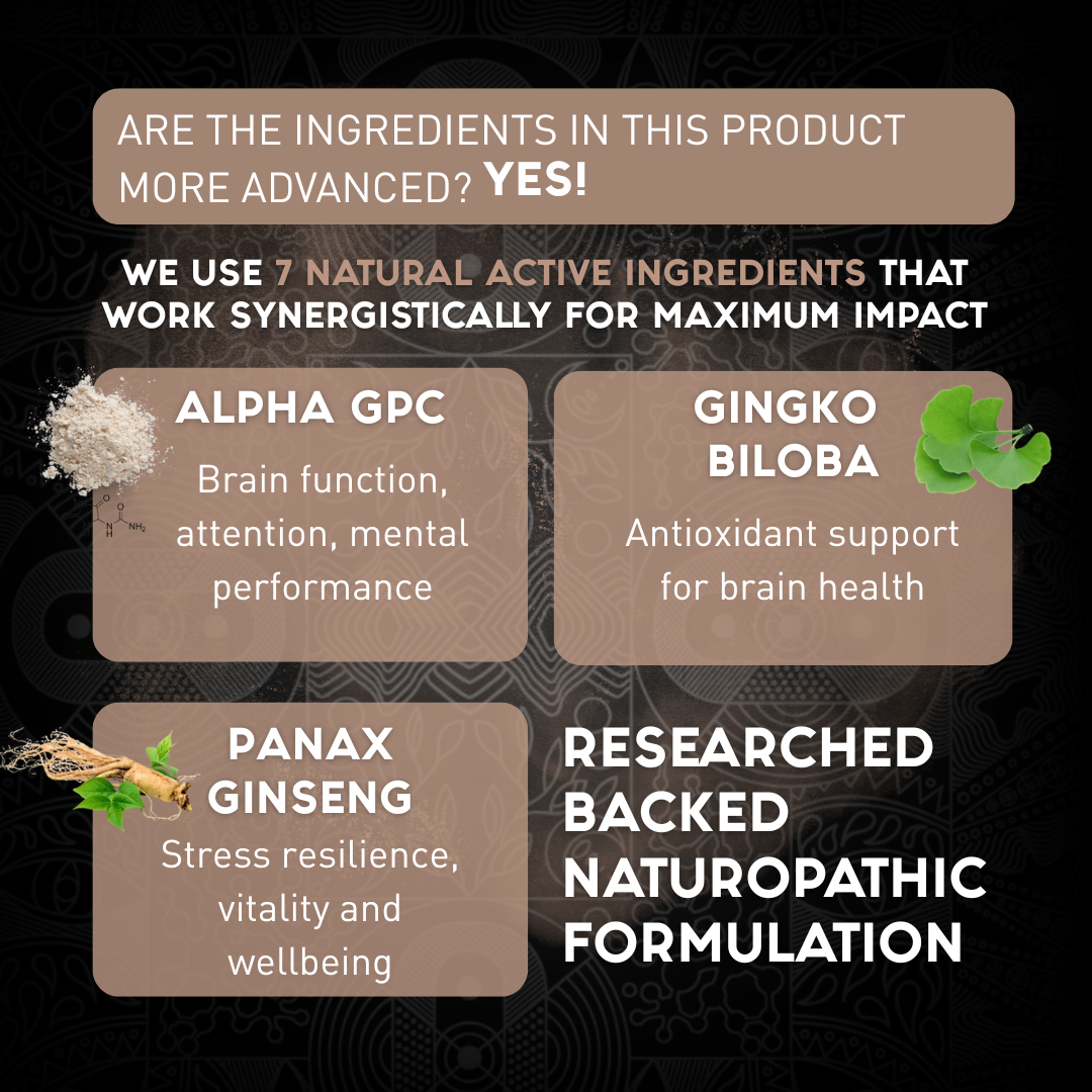 Focus contains a naturopathic formulation of natural ingredients which has undergone 2+ years of research & development. The 7 key active ingredients are: Bacopa, Lions Mane, Ginkgo Biloba, Alpinia Galanga (EnXtra), Panax Ginseng, L-tyrosine and Alpha-GPC. These work synergistically and are known for their ability to support brain function, enhance memory, and promote calm focus without overstimulation.